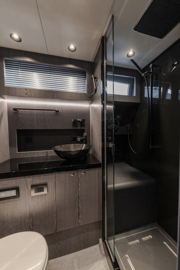 The GLADIATOR 493 GRANDE is designed to deliver modern classic appeal, luxurious and comfortable interiors, as well as an exceptional cockpit for entertaining your guests like no other 50-foot boat. It is equipped with a deep swim platform that can optionally be converted into a hydraulic staircase for swimming or boarding. The aft sun deck is generous and conceals a garage, while the helm station is protected by a laminated glass windscreen. The front deck offers the exact same layout as the 431 WA, with its enormous sunbathing area and deckchair.